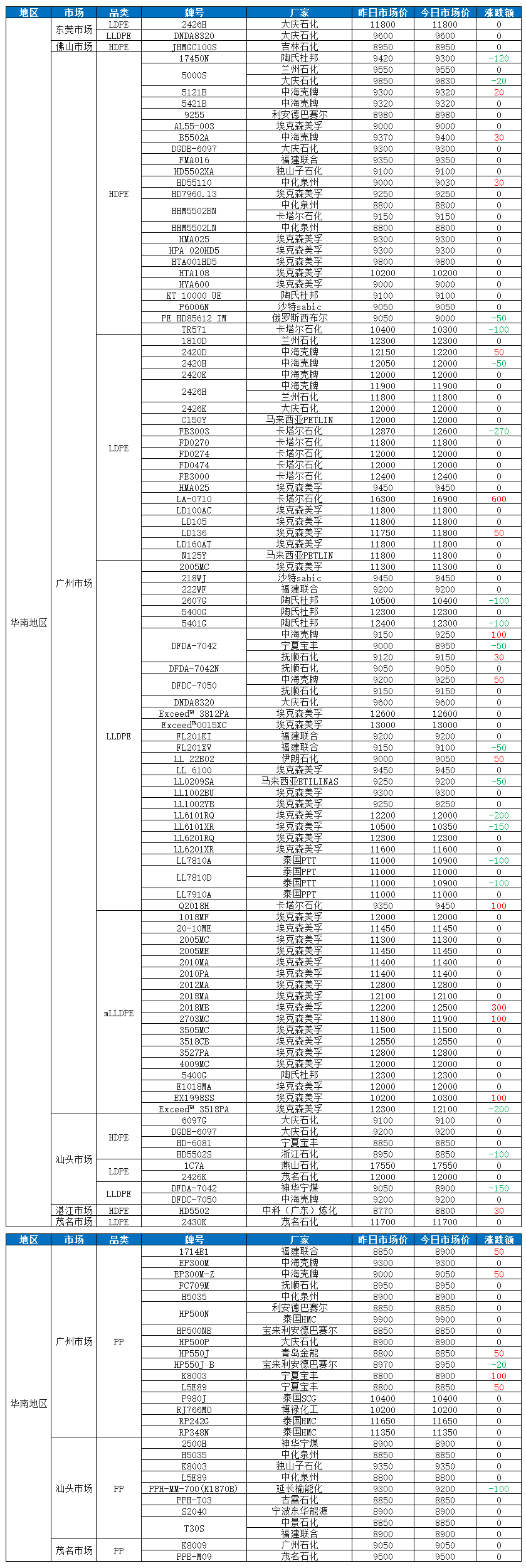華南塑價漲跌互現!PE最高漲600,最高跌270,PP最高跌100!(20220530)