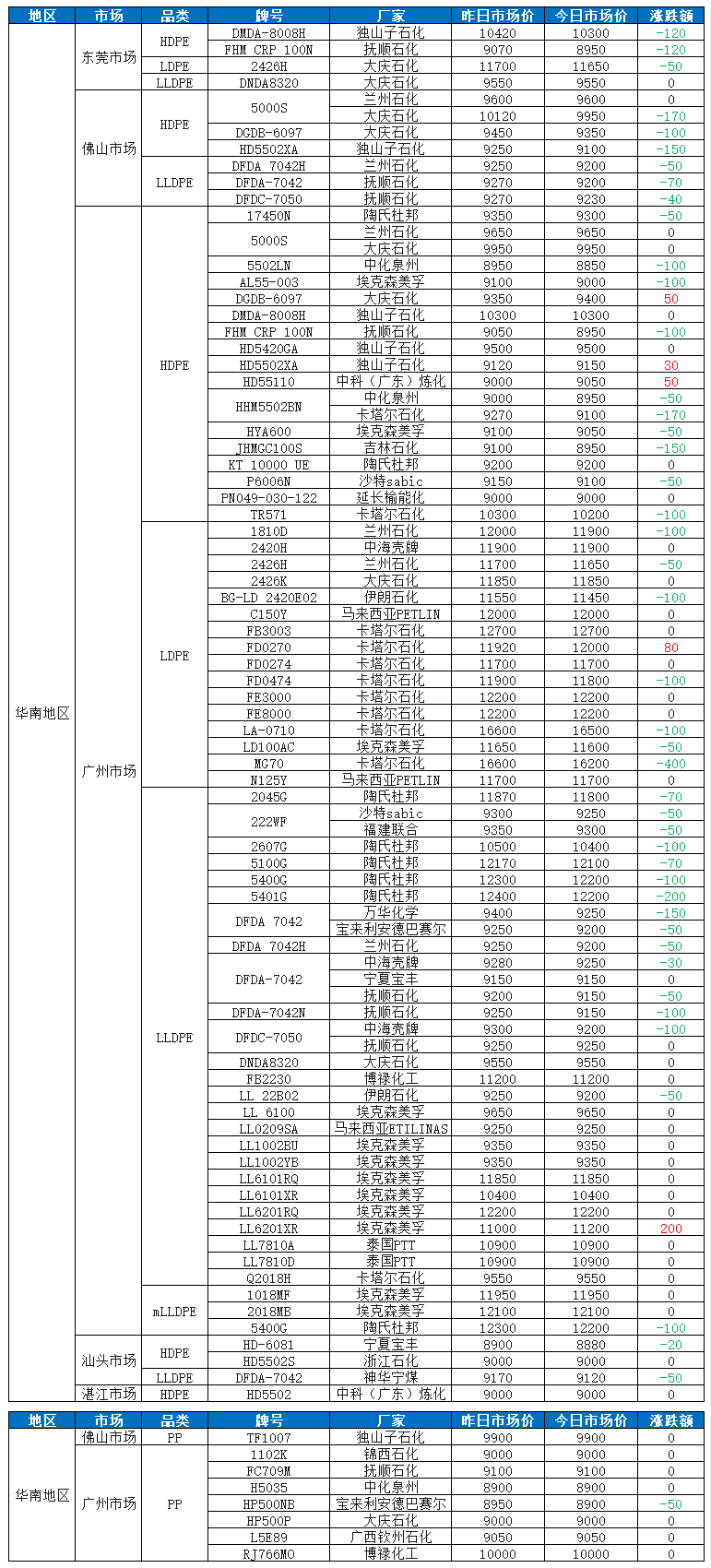 華南塑價(jià)弱勢(shì)震蕩!杜邦PE全線上漲,汕頭市場(chǎng)PP全線下跌(20 - 閱73