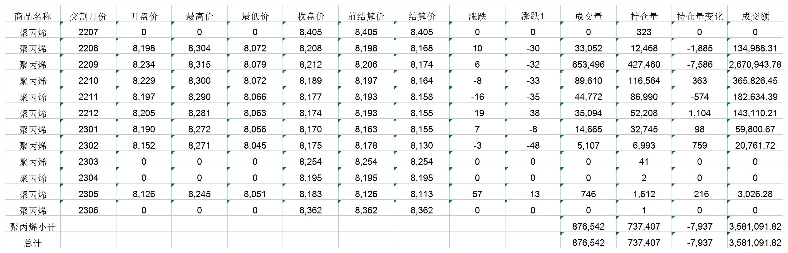 大連商品交易所7月7日PP行情表