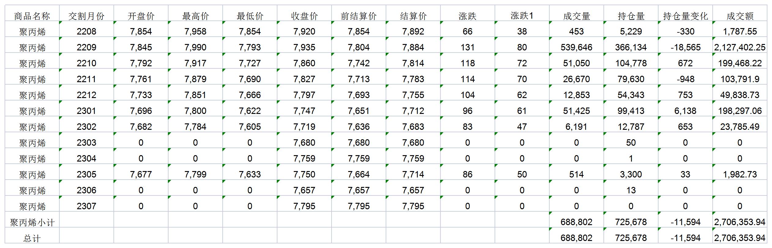 大連商品交易所7月26日PP行情表