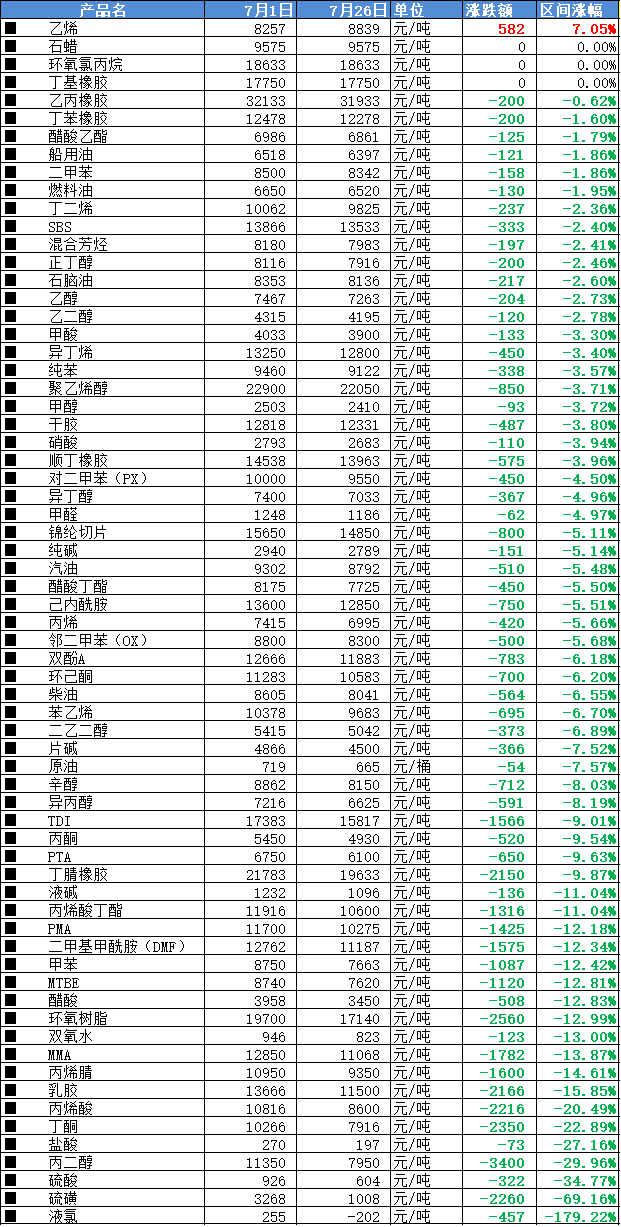 暴跌179%!幾十種化工原料價格下跌