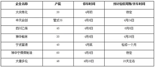 如以上,4月份除長期性停車的大連市有機化學、錦西石油化工等裝置之外,大慶市煉制、神華寧煤煤制油等裝置非計劃停車,更能造成塑膠從業人員關心。計劃停車的中天合創列管式裝置停車,關鍵涉及到PPH-T03的產量損失。四川丁二烯涉及到L5E89和管件的產量,匯能集團大同關鍵涉及到S1003等型號的產量損失。