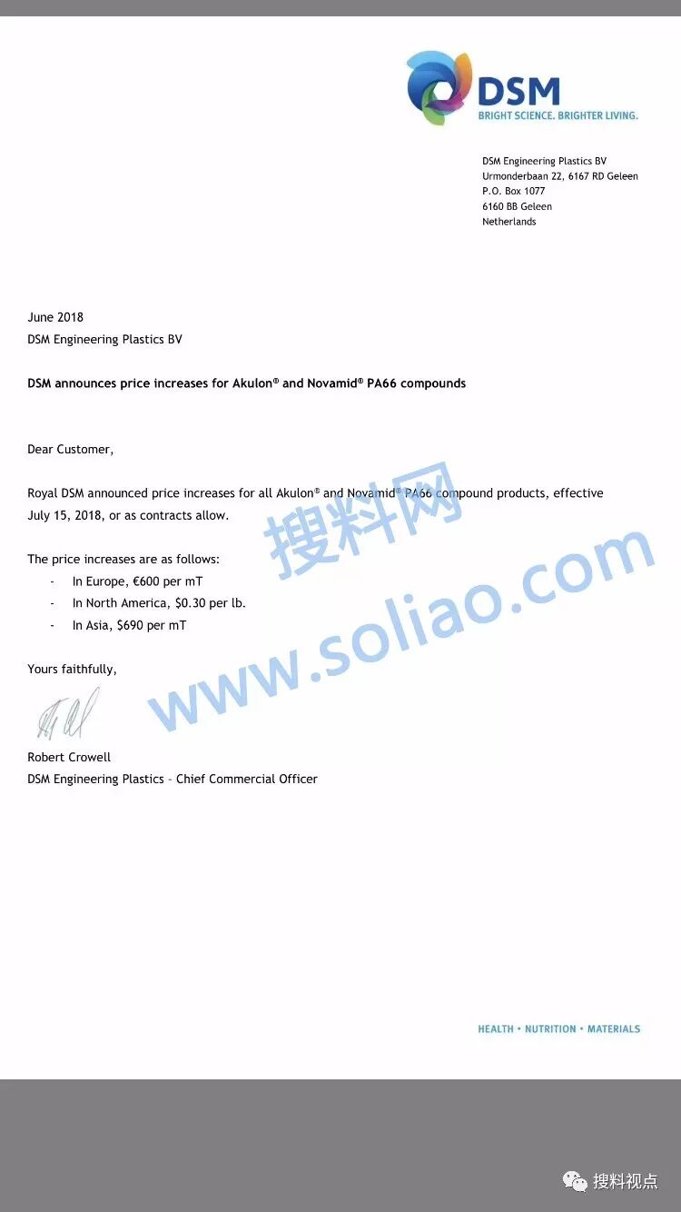 已有人閱讀此文 - -繼巴斯夫、杜邦、朗盛、奧升德PA66價格上調之后,又一家化工巨頭——帝斯曼【DSM】宣布了PA66漲價信息!