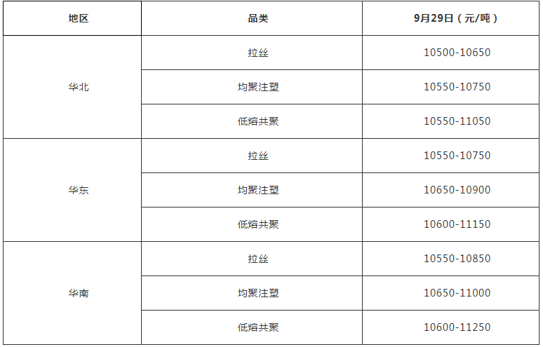 行情綜述:上周國內(nèi)PP市場國慶長假休市,期貨市場無報(bào)價(jià)。雖然市場仍有銷售,但基本上都是在假前報(bào)價(jià)的基礎(chǔ)上加價(jià)銷售,市場因人員放假出游,并不活躍。