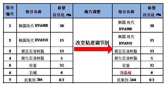 在確保配方黏稠度和粘合抗壓強度不會改變的前提條件下,提升膠的強度和軟化點是配方調(diào)整的方位。配方里將石臘換為微晶蠟,提升了軟化點和耐熱性,松香甘油酯比松脂的耐熱性性能高且能提升膠的粘合抗壓強度。就EVA環(huán)氧樹脂的調(diào)整而言,EVA800強度高、軟化點高,但若只將EVA910換為EVA800,膠的黏稠度則升高,因此將15份EVA910分派為10份EVA800和5份EVA900。