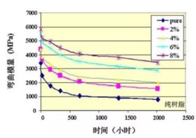 之上納米技術高分子材料方式在緩減吸水速率、減少吸水量的另外,在非常大水平上還改進了尼龍6/66因吸水產生的不良影響。如滌綸蒙脫土納米技術高分子材料吸水后,物理性能的降低和規格轉變要低于純滌綸。另一方面,上文引入的這種共混和無機物納米技術復合型的報導在物理性能上均得到改進,如Tg、應變速率的提升這些,即使吸水以后物理性能有一定的下降,下降的力度也遠遠地低于添加蒙脫土后所提升的力度。下圖是不一樣成分的蒙脫土的尼龍6原材料,置放一段時間后彎曲模量產生的轉變,從圖上能夠看得出,即便是2%蒙脫土的加上量,在做到飽和狀態吸水率后,彎曲模量也會高于純尼龍6許多。
