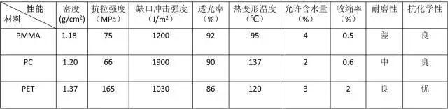 透明塑料首先必須有高透明度,其次要有一定的強度和耐磨性,能抗沖擊,耐熱性要好,耐化學性要優,吸水率要小,只有這樣才能在使用中,滿足透明度的要求而性能穩定,PMMA、PC和PET的性能對比如下表所示。