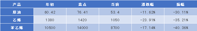從上游來看,原油跌至本年度的低位,據監測,美國原油處于全年低位區域53-55美元/桶附近。,據數據統計美國WI原油較年初的價格跌去11.62%,較今年以來的76.41美元/桶跌幅達30%以上。而東北亞乙烯亦是跌近幾年的歷史低位,受到下游衍生產品的下跌不止拖累,下游市場疲軟,低點至920美元/噸,當前逐步反彈至1050美元/噸,較年初的價格跌23.91%,高低點振幅在35.21%,另一主要的原料純苯表現同樣乏善可陳,在多數終端產品下行的壓力下,近期也出現疲弱跡象。苯乙烯方面,因上半年創下歷史相對高點,下半年的回調更為猛烈,國內市場價格高低點波動達40.36%。