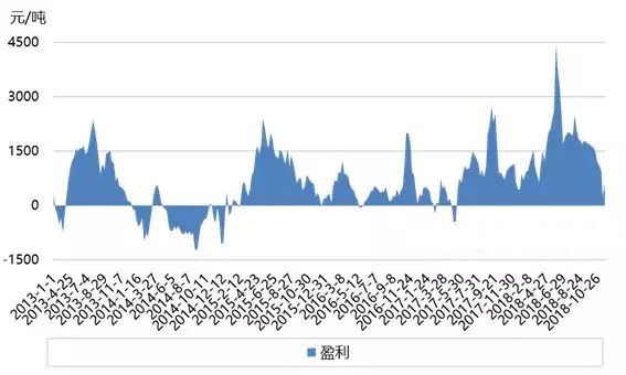 從苯乙烯產業的利潤圖上可以看出,近幾年苯乙烯廠商維持相對較高的平均利潤率,近三年以來的理論利潤平均值在800-1000元/噸波動,2018年以來更是長時間的保持較高的平均利潤值在千元/噸以上。上半年苯乙烯價格飚漲,廠商的生產利潤高達2千以上,極大的擠壓下游主體產業的利潤分配,繼續呈現利潤靠攏上端產業,而下游端企業表現較為被動。10月份開始的一波深度下跌,延續至11月上旬,市場價格一度跌至2017年的低點8200元/噸的水平相差僅百余元(以國產貨源主流出廠價為基礎)。