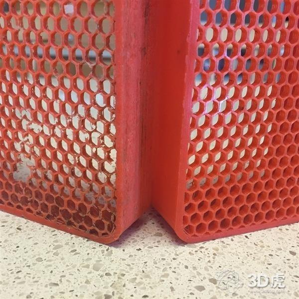 由上圖可見,右邊的那個只用了一周的PLA 3D打印過濾網只是稍微臟了點,沒什么變化;而左邊的那個已經明顯褪色,變得多孔而且發脆,上面的網格結構也開始破裂。