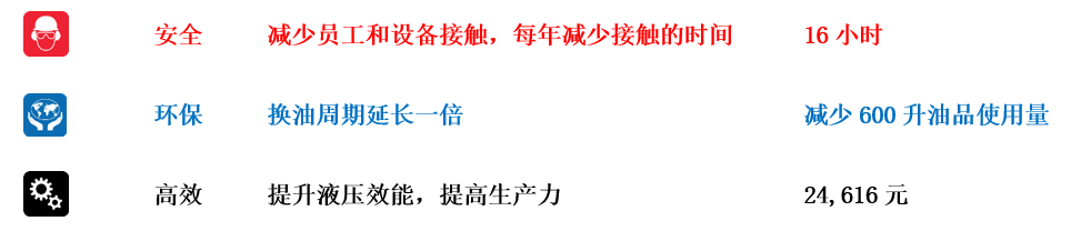 最終,通過此次美孚?優釋達?系列服務,該企業的注塑機液壓效能得到明顯改善,每年還為企業帶來了人民幣24,616元的經濟效益。