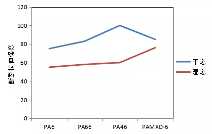 比照各種各樣四種尼龍在二種情況下的開裂拉漲抗壓強度,脂環族尼龍吸濕后抗拉強度降低力度較,在其中PA46的減幅在40%上下,而脂環尼龍PAMXD-6的減幅在10%上下。