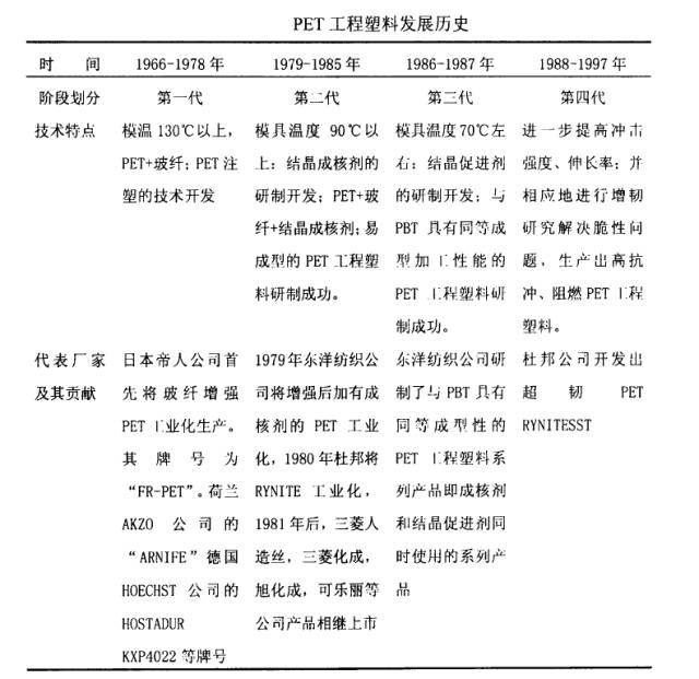 PET工程塑料的發(fā)展趨勢能夠 分成四個環(huán)節(jié),業(yè)內(nèi)各自稱之為四代PET,各代PET的發(fā)展趨勢特性以及意味著生產(chǎn)廠家以下表所顯示: