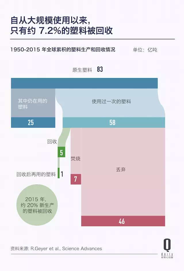 這個驚人的數字有時間的影響。人們早年沒有意識到塑料的環境問題。塑料回收率自 1980 年后就在一直上升,到了 2014 年前后達到了近 20%。