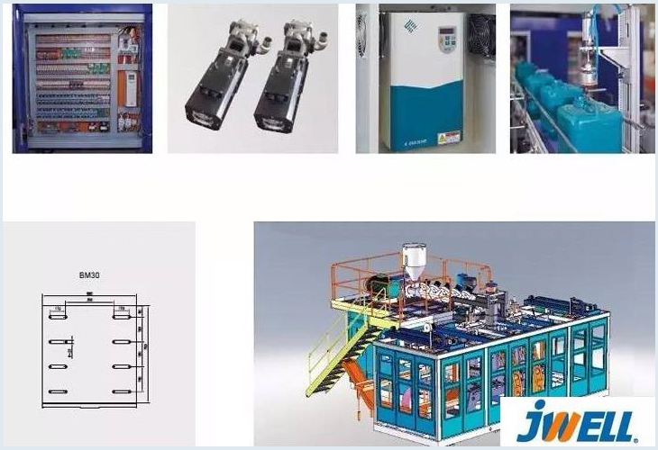 適用生產制造10-30L各種各樣化工廠涂料桶,選用回轉式擠塑機頭,上吹構造,便于碼放桶的全自動去毛邊、毛邊線上運輸、產品線上檢漏、運輸、裝包等;選用液壓機伺服電機驅動器,SIEMENS人機對戰自動控制系統,降低人力成本,提升生產率。