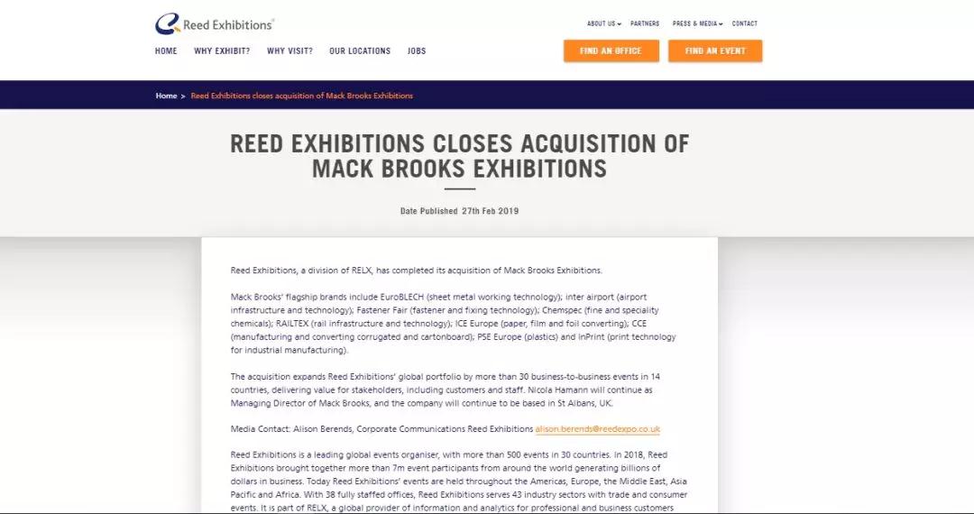 2019年2月27日,勵訊集團旗下的勵展博覽集團(ReedExhibitions)官網發布消息稱,已完成對MackBrooksExhibition的收購,包括ICEEurope(歐洲軟塑薄膜包裝加工展)、CCE(慕尼黑國際瓦楞展與紙箱制作展覽會)等旗艦品牌展會將與勵展博覽集團旗下現有展會資源強強聯合,為行業客戶提供更大的價值。