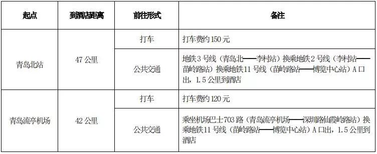 七、交通線路:本次大會將于 11 月 19 日和 11 月 22 日提供在 青島流亭國際機場和青島北站安排接送站,請優先選擇這二個站點的高鐵和飛機,具體接站班車時間另行通知。酒店位置及行車路線見附件一。