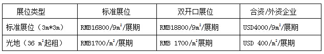 標(biāo)準(zhǔn)展位: (3M×3M)展位(包括三面圍板、楣板、一桌二椅、220V電源插座、清潔費(fèi)等)。