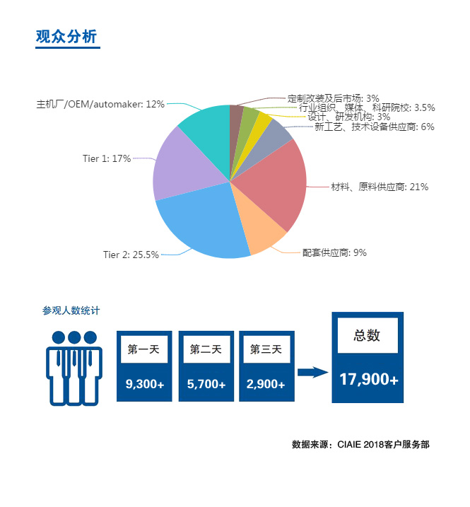 由英佛會議展覽(上海)有限公司主辦、中國汽車工業協會汽車相關工業分會、中國汽車工業協會車身附件委員會、上海國際汽車城(集團)有限公司、上海市嘉定區安亭鎮人民政府等相關單位全程參與協助支持的“2018第八屆中國上海國際汽車內飾與外飾展覽會”(CIAIE 2018)于8月15-17日在上海汽車會展中心成功召開。展會共迎來中國、美國、加拿大、德國、俄羅斯、法國、英國、日本、韓國、西班牙、意大利、澳大利亞、墨西哥、印度、巴基斯坦、捷克、中國臺灣、中國香港等20多個國家和地區的近18000名專業觀眾。