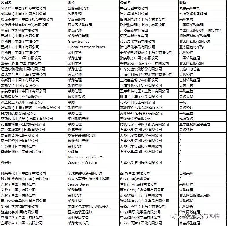 阿科瑪;阿克蘇諾貝爾;埃克森美孚;艾道瑪;艾津農(nóng)化;艾森半導(dǎo)體;艾仕得涂料;翱藍(lán)特;巴斯夫;拜森化工;碧辟;波士膠;常熟市匯邦新材料;出光潤(rùn)滑油;傳化;道達(dá)爾;道康寧;德謙化學(xué);帝斯曼;東勝;杜邦農(nóng)化;芬美意;福斯;德美;漢高;漢姆德華;漢圣;好富頓;好收成;亨斯邁;花臣;嘉寶莉;嘉實(shí)多;嘉榮;江山農(nóng)化;江蘇司能;江蘇揚(yáng)農(nóng);金力泰;金陵力聯(lián)思;金山聯(lián)貿(mào);康普頓;科萊恩;科思創(chuàng);殼牌;可蘭素;昆山石梅;朗盛;立邦;利安隆;鈴鹿;龍?bào)?路博潤(rùn);邁克斯;邁圖;南寶樹脂;南京紅寶麗;寧波漢圣;紐佩斯樹脂;歐諾法;龐貝捷;奇華頓;前程石化;瑞佳;潤(rùn)英聯(lián);塞拉尼斯;沙多瑪;沙提;山東泰和;上海華誼;上海納克;上海昭和高分子;上緯;圣萊科特;勝牌;石家莊鑫隆威化工;蘇州金駝鈴;索爾維;泰和;陶氏;瓦克;萬華;先正達(dá);宣偉;雪佛龍;亞什蘭;洋紫荊油墨;藝康;英威達(dá);贏創(chuàng);優(yōu)雅化工;贊宇科技;湛新樹脂;張家港迪克;張家港協(xié)爾維;長(zhǎng)春化工;長(zhǎng)谷川;長(zhǎng)興;浙江傳化華洋;浙江衛(wèi)星;鎮(zhèn)江聯(lián)成;中遠(yuǎn)關(guān)西;中遠(yuǎn)佐敦;重慶斯托賽克藍(lán)峰;莊信萬豐;紫荊花;佐敦
