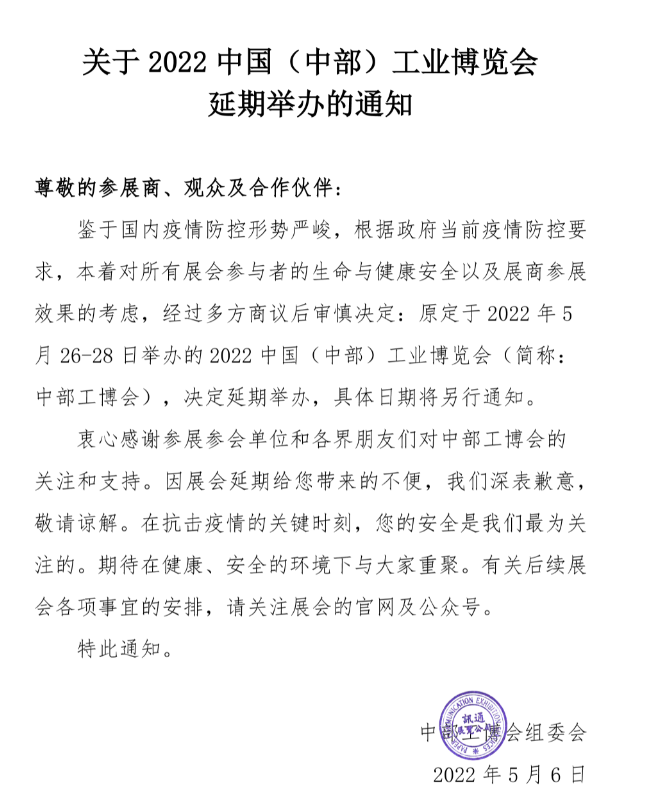 中部工博會組委會發(fā)布公告:鑒于國內(nèi)疫情防控形勢嚴(yán)峻,經(jīng)過多方商議后決定,原定于2022年5月26-28日舉辦的“2022中國(中部)工業(yè)博覽會”延期舉辦,具體日期將另行通知。詳細(xì)通知如下: