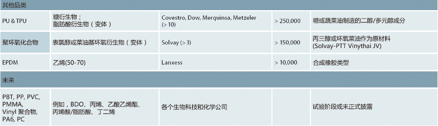 顧客針對生物塑料非凡的特性規定也一樣推動了聚對苯二甲酸丙二醇酯 (PTT ) 的發展趨勢,該材料特別是在適用延展性加工工藝紡織品化學纖維的運用(見表1)。假如把熱固性塑料塑料也考慮到進來,其衍生物的總數會大量。生物基聚氨酯材料(PU)或聚環氧樹脂化學物質現如今也是有各種不同的運用,市場前景看中(見圖6)。有意愿的公司能夠 運用總數與日俱增的商業服務可用生物基單個結構單元,主要是二元醇或聚醚多元醇,其特性的改進室內空間也跟生物成份一樣大。