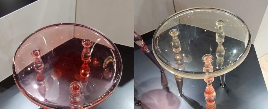 “SHIRANUI神密之翼”展現了二種狀況。左圖上的椅子應用了歷經一段時間后消化吸收光源的一部分的顏色會變深的材料。坐面的正中間一部分變成了暗紅色。下圖中的椅子則應用了僅有遭受紫外線照射的一部分變為鮮紅色的材料。它是僅對椅子腳部直射紫外光時的情況。