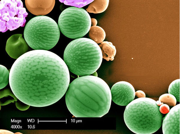 PMMA 自拍照 。自我介紹:超順磁聚甲基丙烯酸甲酯(PMMA)微粒,旁邊的棕色小球是Fe2O3納米晶體,它們自發的聚集到一起。