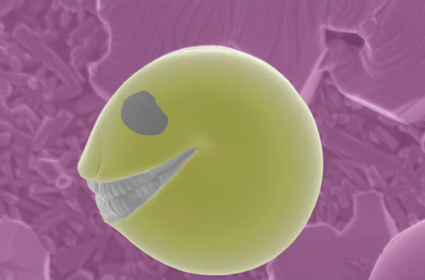 氧化銅小塊自拍照片。自我介紹:直徑約為3.5微米,該顆粒是氧化銅在鋁基體上升華凝聚后得到的,像游戲中的“吃豆人”一樣,它的眼睛和鼻子都是在原始照片中就有的,只不過增強了顏色。