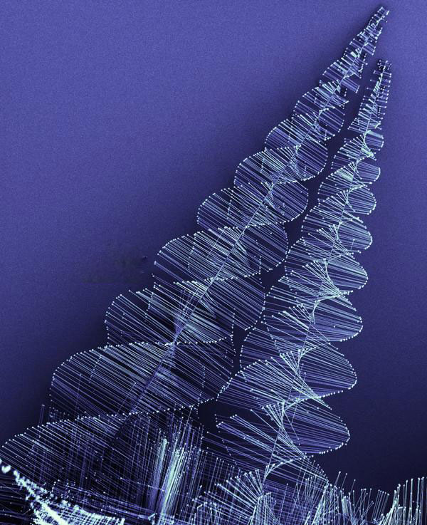 硫化物納米自拍照 。自我介紹:這兩棵小樹是硫化物納米線形成的復雜結構,它的“樹干”其實是大量的螺位錯,看起來呈螺旋形態。