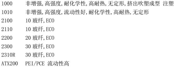 ULTEM:1000為非增強(qiáng)系列,2000為玻纖增強(qiáng)系列(GF10-40、EPR為可電鍍),4000為耐磨系列,CRS5000為耐化學(xué)系列,9000為航空專用系列,HTX為抗沖擊,AUT為汽車領(lǐng)域系列,HU為食品醫(yī)療級,AR為航空領(lǐng)域,SF為高流動薄壁系列,STM為電線電纜應(yīng)用系列,ATX為PEI/PCE合金(伸長率70%)