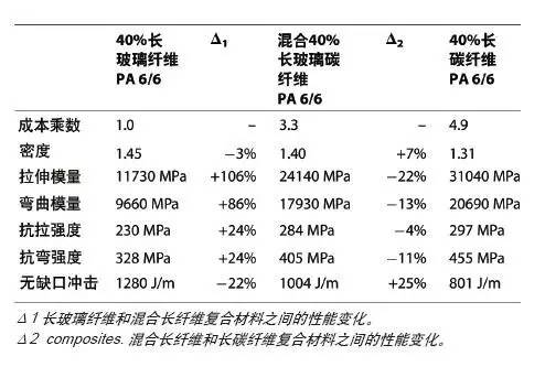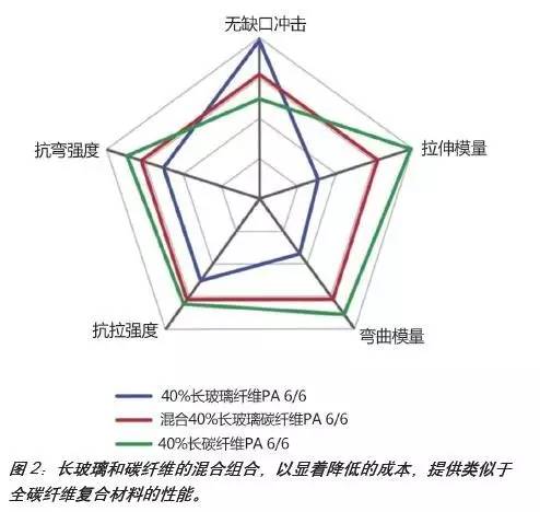 初期的試驗實驗說明,將這二種纖維種類融合在一起,造就了與眾不同的性能協同作用,其性能大大超越了纖維自身的種類。包含長玻璃纖維增強原材料提升了使用性能,超過了獨立應用長碳纖維可得到的范疇。此外,加上長碳纖維增強原材料可將彎曲剛度和抗壓強度提升到比長玻璃纖維能夠做到的高些的值。最重要的是,帶有較適度性的長碳纖維增強原材料的熱塑性樹脂將比全碳長纖維增強復合材料劃算得多(圖1)。