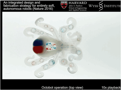 傳統的機器人大多由剛性材料制備,現有的具有柔性的機器人也擺脫不了硬質控制系統和供能系統。哈佛大學的科學家借助過氧化氫催化分解產生的氧氣及可以自我反饋的微流體控制系統制備出了世界首個完全軟體的且自我驅動的機器人,外形類似小章魚,無需電力和外界控制,可獨立控制機械臂運行4~8分鐘。整個系統的核心部件如氣動傳輸網絡、燃料庫、催化反應室等通過3D打印制作。其集成設計和制作方法使得在該結構中的多材料可編程組裝成為可能,為全軟體自主化機器人打下了基礎。