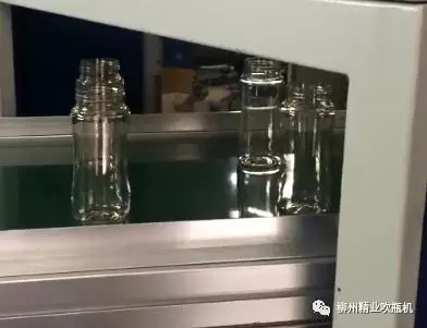 (圖為精業機器三工位注拉吹機WISBIII--40新款奶瓶機現場自動傳送帶上的奶瓶)