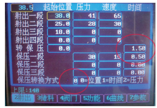 該參數(shù)設(shè)定是位置切換方式,但轉(zhuǎn)保壓位置設(shè)定是0 mm,注塑機(jī)在執(zhí)行工藝時(shí),指令只能執(zhí)行到射出一段或者射出二段,射出時(shí)間到了,工藝不再執(zhí)行下去,實(shí)際上只是一個(gè)以時(shí)間切換方式完成的V-P切換(有的注塑機(jī)程序會(huì)報(bào)警不再執(zhí)行)。在產(chǎn)品對(duì)工藝要求嚴(yán)格的場合,不嚴(yán)格的注塑工藝肯定是不穩(wěn)定且產(chǎn)品合格率不高的工藝。