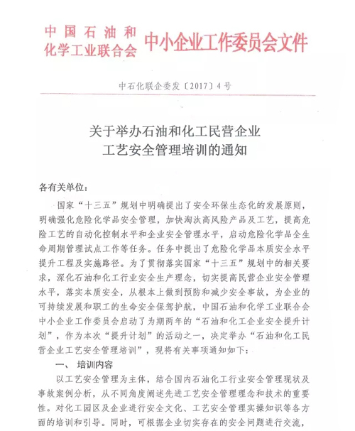 關于舉辦石油和化工民營企業(yè)工藝平安管理培訓的告訴