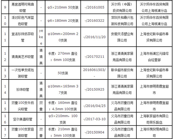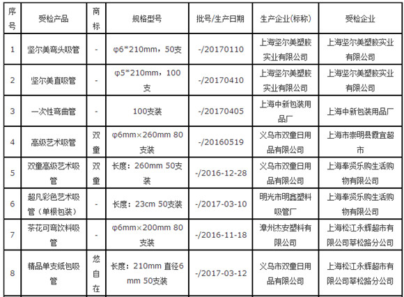 2017年上海市塑料吸管產品質量監(jiān)督抽查所檢新項目合乎有關規(guī)范的商品和企業(yè)名錄