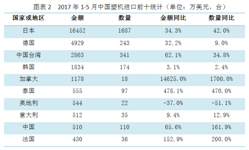 從圖1能夠 看得出,2017年的1-5月,中國塑料機(jī)進(jìn)口金額與2016年同比增加呈迥然升高趨勢,總數(shù)也是有持續(xù)上升。