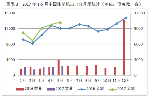 2017年1-5月的中國塑料機(jī)順差額為13785萬美元;5月份的塑料機(jī)順差額為3570萬美金。