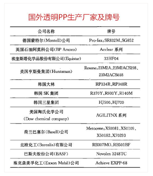 中國于二十世紀90年代逐漸科學研究和開發設計透明PP樹脂,發展相對性海外比較晚。下表為中國普遍的透明PP專用型料型號,殊不知,中國在透明PP產品的類型和銷售市場消耗量及其有關生產工藝的科學研究和開發設計層面與海外企業仍具備很大的差別。
