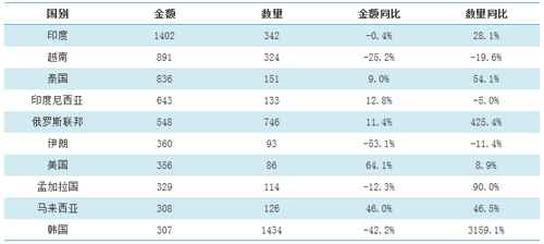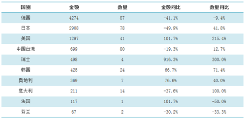 中國中國臺灣、西班牙、德國等三個我國或地域均有較大幅的降低,法國、日本、德國、荷蘭等四個我國則均有大幅升高,在其中,法國的增長幅度也是做到了916.3%。
