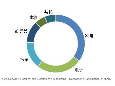2015年,全世界家用電器ABS使用量占有率在30%之上,處在主導(dǎo)性。因為ABS塑料具備高設(shè)計方案協(xié)調(diào)能力、重量較輕、低成本、抗腐蝕、耐熱、阻燃等級高、外型亮麗及其具備優(yōu)質(zhì)的機械設(shè)備特點,城市化進(jìn)程和家用電器消費的提升是ABS市場要求猛增的關(guān)鍵要素之一,將來全世界家電業(yè)的擴(kuò)大將為ABS市場的增長造就有益的標(biāo)準(zhǔn)。