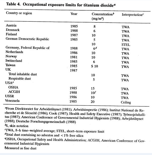 就算是生產(chǎn)制造二氧化鈦的車間的工作員觸碰到的二氧化鈦濃度值(最高值6.258米g/m3,極小值 0.319mg/m3)也遠(yuǎn)小于檢測(cè)標(biāo)準(zhǔn)(10mg/m3)。