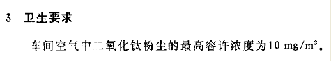 國(guó)家行業(yè)標(biāo)準(zhǔn):《車間空氣中二氧化鈦粉塵衛(wèi)生標(biāo)準(zhǔn)(GB 11522-89)》,要求了車間空氣中該化學(xué)物質(zhì)的最大允許濃度值及檢驗(yàn)方式――