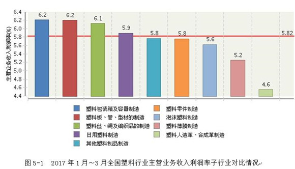 已有人閱讀此文 - -2017年一季度,塑料制品領域主營業務毛利率5.82%,比同期相比提升0.02點。在其中,塑料包裝木箱及器皿制造主營業務收入利潤率為6.21%;塑料板、管、鋁型材的制造主營業務收入利潤率為6.2%;塑料絲、繩及編織品的制造主營業務收入利潤率為6.12%;日用塑料制造主營業務收入利潤率為5.89%;塑料零件制造主營業務收入利潤率為5.76%;泡沫塑料塑料制造主營業務收入利潤率為5.62%;塑料塑料薄膜制造主營業務收入利潤率為5.25%;塑料人造皮革、pvc人造革制造主營業務收入利潤率為4.55%,別的塑料制品制造主營業務收入利潤率為5.77%。