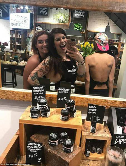 從科羅拉多州的玻爾得市到賓西法尼亞州的費大城市,再到紐約,該化妝品公司的職工們競相脫下衣服,只衣著含有品牌圖標的圍裙團體現身。相片中,男孩和女孩職工衣著灰黑色圍裙,將誘人的孤獨背影交給群眾,而且還大氣地在店內和店外開展自拍照。