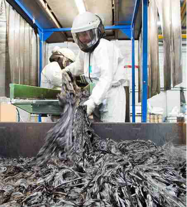 照片敘述的是ELG碳纖維有限責(zé)任公司將熱裂解回收的碳纖維裝車(chē)到粉粹機(jī)中?