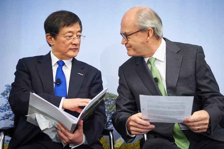 2016年瑞士巴塞爾,中國(guó)化工老總?cè)谓ㄐ屡c先正達(dá)老總Michel Demare。(來(lái)源于:環(huán)球日?qǐng)?bào))