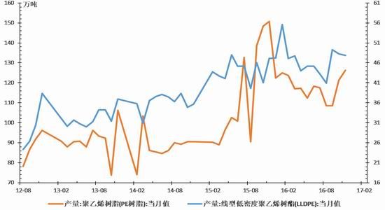 圖7中國PE生產量及LLDPE生產量走勢圖表