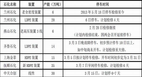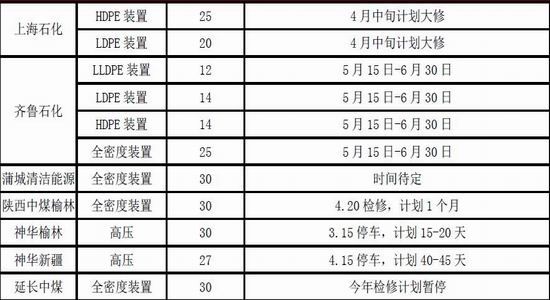 4月份將邁入PE裝置的春天維修小高峰期,到時候有希望PE提供有一定的降低,但還要關心30萬噸級/年的久泰能源和43萬噸級/年的神華寧煤這兩個新裝置在二季度的建成投產狀況。此外,37萬噸級/年的中天合創3月15日25萬噸級裝置先投,3.25有希望全程運作。